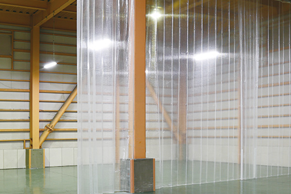 工場内の衛生管理や、防虫・防塵・防災などの用途に合わせて使用したり、作業環境や部署別に間仕切ることが可能です。生地は透明のほか、透明ネット入りや防炎加工になっている生地など様々。